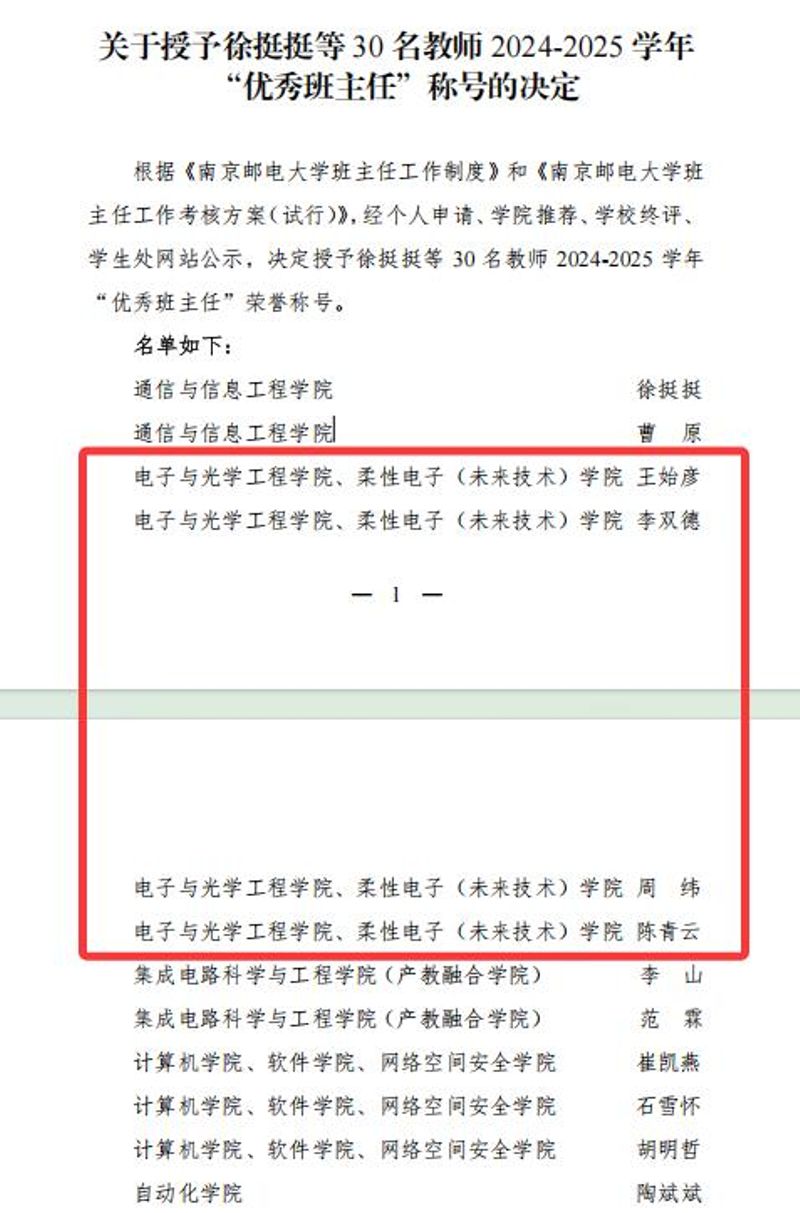 近日,南京郵電大學(xué)2024-2025學(xué)年“優(yōu)秀班主任”評選結(jié)果正式揭曉。全校共30位教師獲此殊榮,其中,電子與光學(xué)工程學(xué)院、柔性電子(未來技術(shù))學(xué)院共有四位教師光榮入選,分別是王始彥、李雙德、周緯、陳青云。本次評選注重學(xué)生的真實(shí)反饋,根據(jù)“學(xué)生評價(jià)情況”(即班主任工作測評分?jǐn)?shù))和班主任提交的各類履職材料,對各位班主任老師的履職情況進(jìn)行綜合評定,最終擇優(yōu)入選。電光柔院此次能夠有四位教師脫穎而出,榮獲校級“優(yōu)秀班主任”稱號,是學(xué)校對學(xué)院班主任工作整體水平和育人實(shí)效的高度認(rèn)可。入選老師在日常工作中,始終堅(jiān)守育人初心,恪盡職守,在思想引領(lǐng)、學(xué)業(yè)指導(dǎo)、生涯規(guī)劃、班級管理等方面傾注了大量心力,贏得了學(xué)生一致好評。此次優(yōu)異成績的取得是學(xué)院長期以來堅(jiān)持立德樹人根本任務(wù)、不斷加強(qiáng)和改進(jìn)班主任工作的成果體現(xiàn)。電光柔院將以此為契機(jī),持續(xù)深化班主任隊(duì)伍建設(shè),充分發(fā)揮優(yōu)秀班主任的示范引領(lǐng)作用,不斷探索學(xué)生工作的新思路、新方法,努力提升人才培養(yǎng)質(zhì)量,為學(xué)生的全面成長成才和學(xué)校的高質(zhì)量發(fā)展做出更大貢獻(xiàn)。撰稿:祝騰審核:徐磊編輯:祝騰